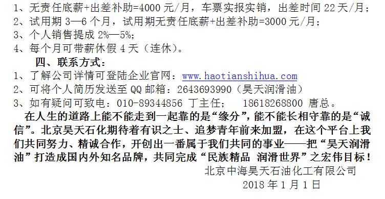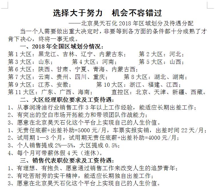 北京昊天石化2018年區(qū)域劃分及待遇分配