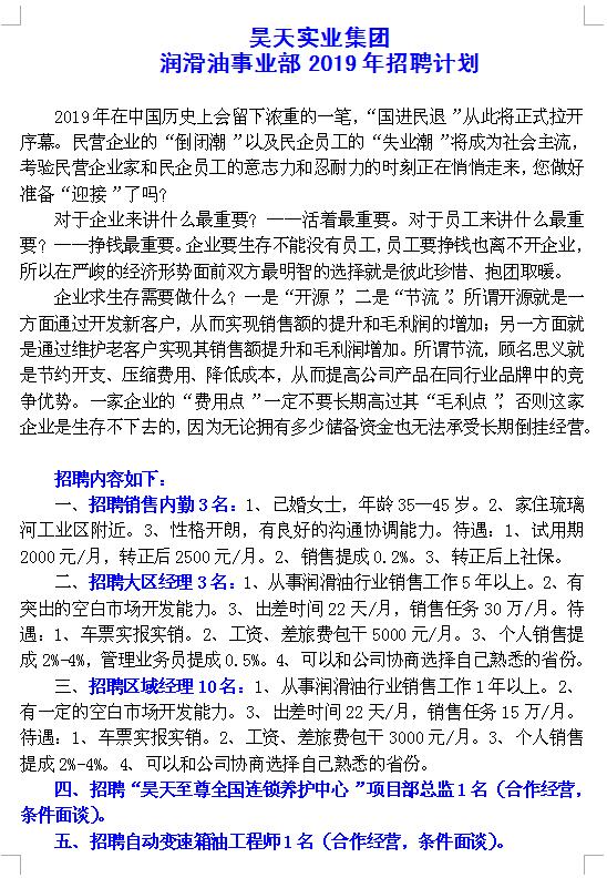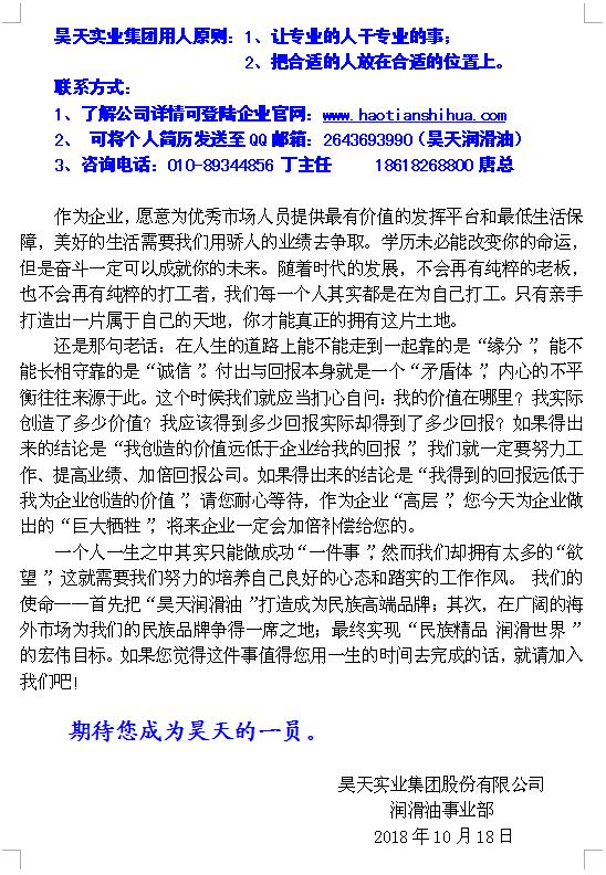 昊天實(shí)業(yè)集團(tuán) 潤滑油事業(yè)部2019年招聘計(jì)劃